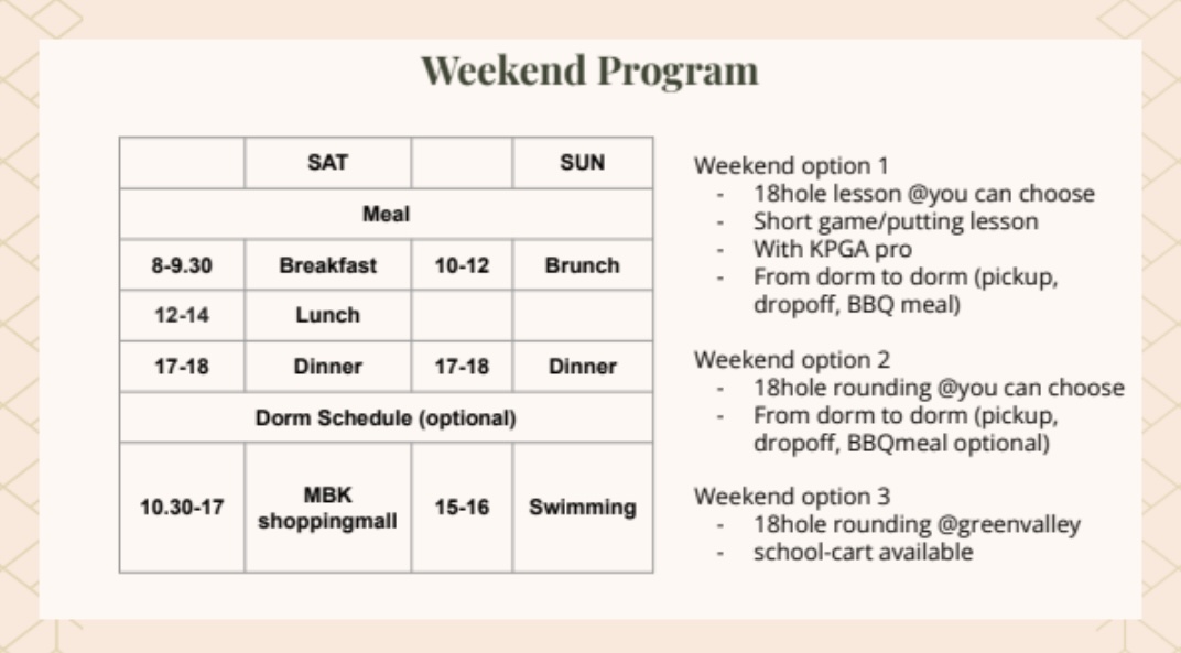 이 프로그램에 참여하는 한국 주니어골퍼들 뿐만 아니라 현재 국제학교에 재학 중인 주니어골퍼들과의 오전스쿨링/오후레슨/기숙사 생활을 통한 교류로 좀 더 폭넓은 시야와 사고를 넓힐 수 있는 기회가 주어집니다.