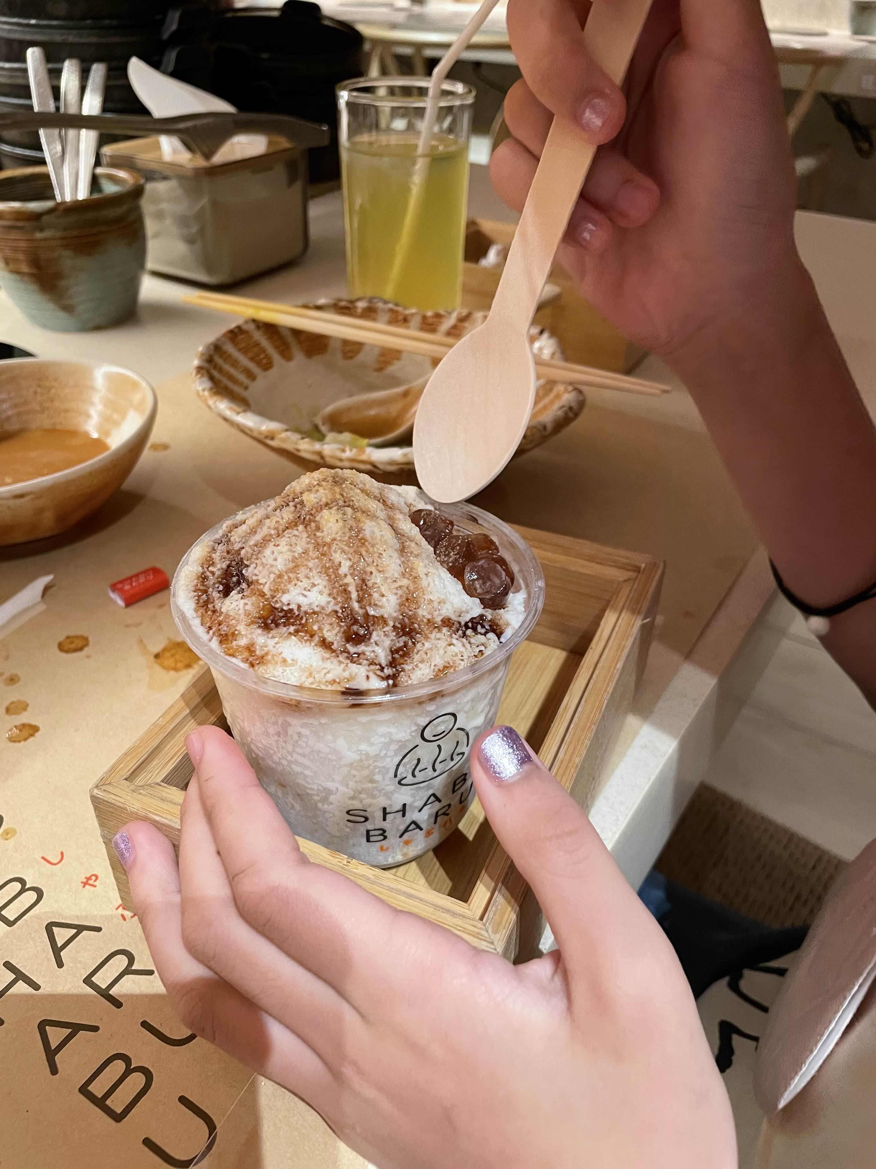다저트도 포함인데 하나는 폴라포 포도맛 나는 주스와 밀크티맛의 빙수로 시켰어요~ 갠적으로 빙수가 더 맛있었어요.